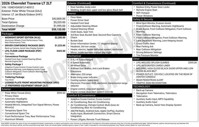 2026 Chevrolet Traverse LT 2LT Polar White Tricoat AWD 8-Speed Automatic 2.5L DOHC