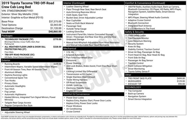 2019 Toyota Tacoma TRD Off-Road V6 Silver 4WD 6-Speed Automatic 3.5L V6 PDI DOHC 24V LEV3-ULEV70 278hp
